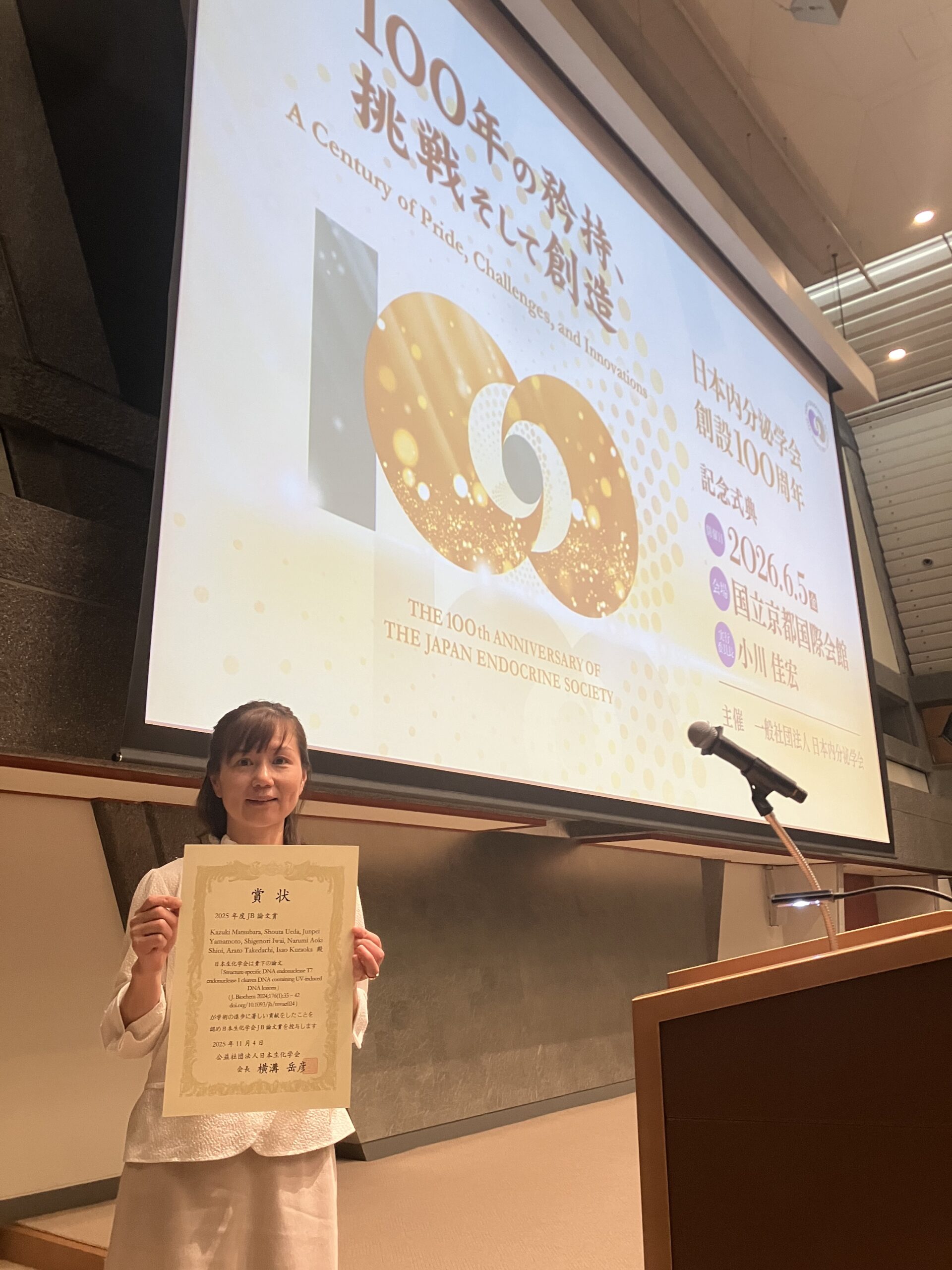 日本生化学会創立100周年記念でJB( The Journal of Biochemistry)論文賞を受賞しました。2025年11月4日の大会会場(国立京都国際会館)で受賞式典が行われました。
